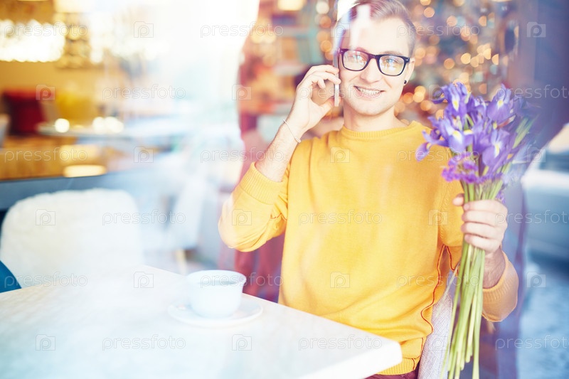 Молодой человек с телефоном кафе