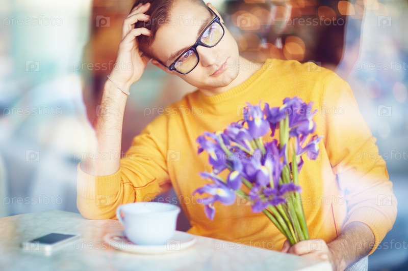 Задумчивый человек с цветами в ожидании любимой
