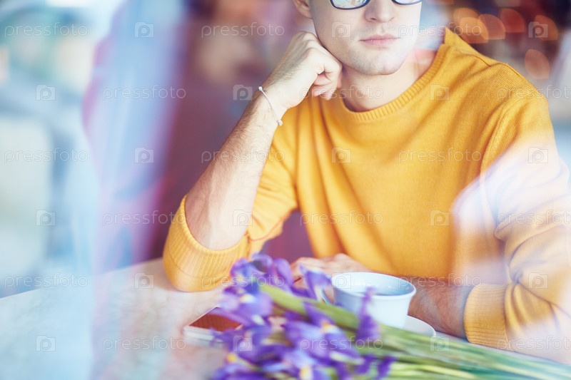 Человек с цветами в ожидании в кафе
