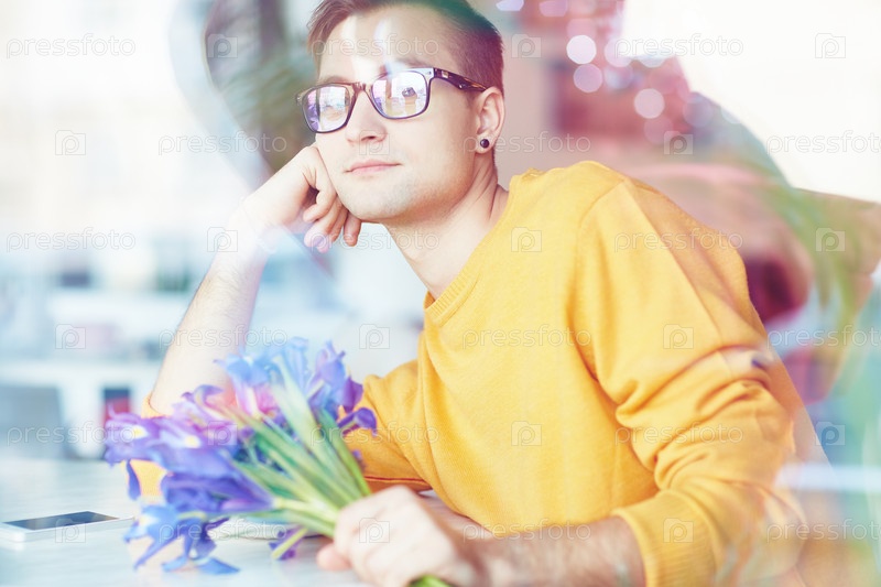 Мечтательный молодой человек в ожидании девушки в кафе