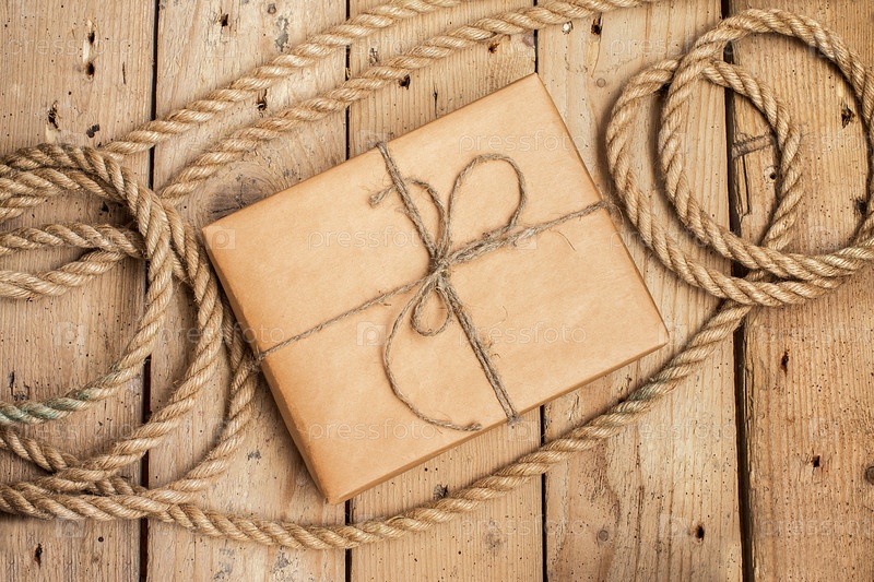 Винтажная подарочная коробка и веревка на деревянном фоне