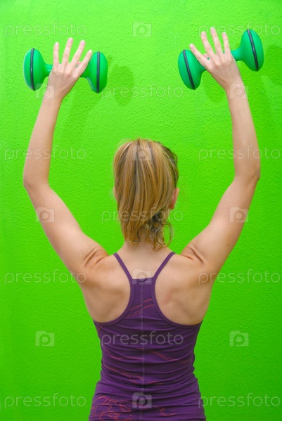 Девушка с гантелями в фитнес-клубе