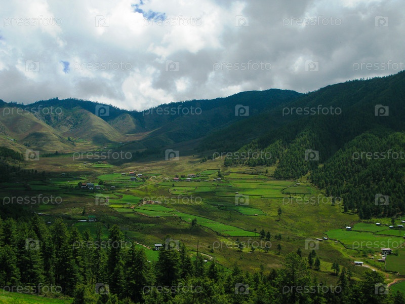 Пейзаж горной долины Фобхиха, Бутан, Гималаи