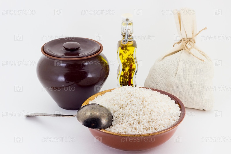Рис с глиняным горшком и медной ложкой