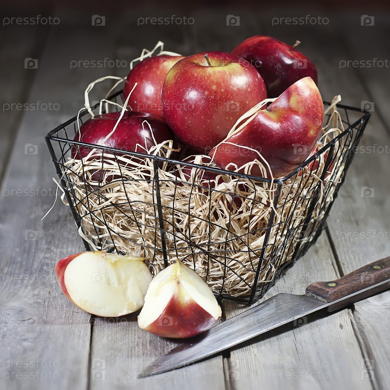 красные яблоки в проволочной корзине с сеном на старом деревянном столе