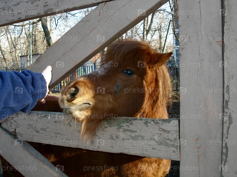 Лошадь просунула морду через отверстие в ограде