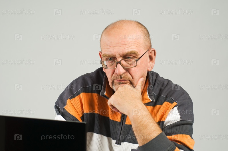 Пожилой человека, сидящий за столом с ноутбуком