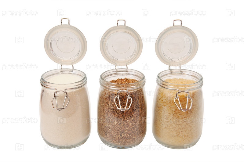Стеклянные банки с крупами и сахаром