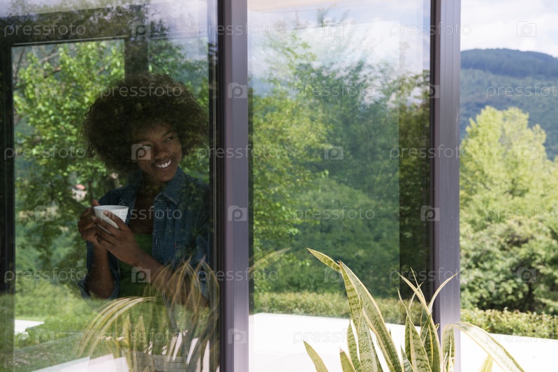 Афроамериканка с кофе у окна
