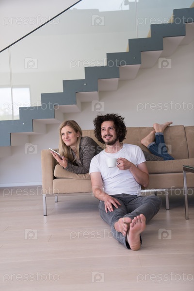 Пара отдыхает дома с планшетами