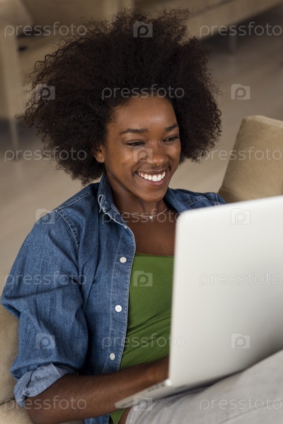 Афро-американских женщин дома в кресле с ноутбуком