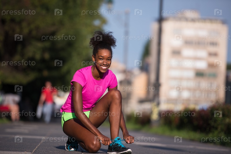 Женщина-бегун, затягивающая шнурок для обуви