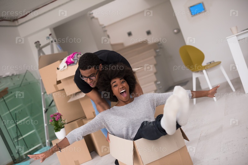 Афро-американская пара играет с упаковочным материалом