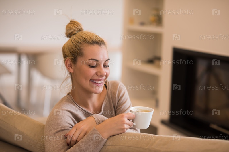 Женщина с кружкой возле камина