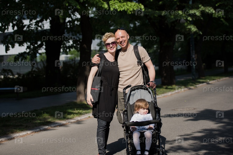 Пара с детской коляской в летнем парке