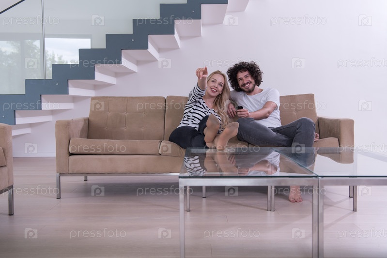 Молодая пара на диване смотрит телевизор