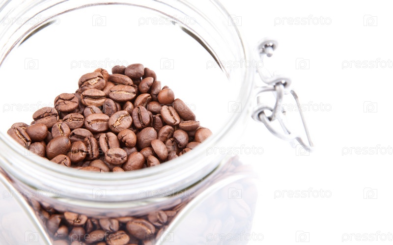 Ароматные кофейные зерна в стеклянной банке на белом фоне