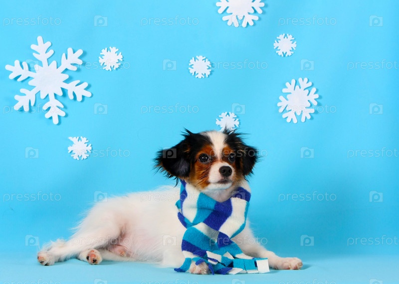 Красивый щенок породы фален в теплом шарфе