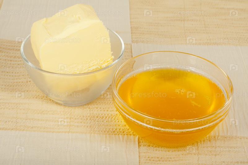 Цельное и топленое масло в стеклянных мисках крупным планом