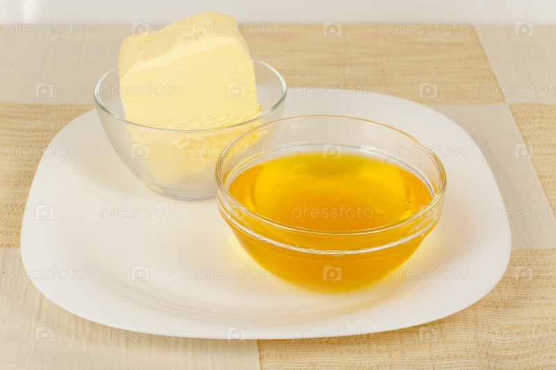 Цельное и топленое масло в стеклянных мисках крупным планом