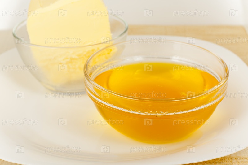 Цельное и топленое масло в стеклянных мисках крупным планом
