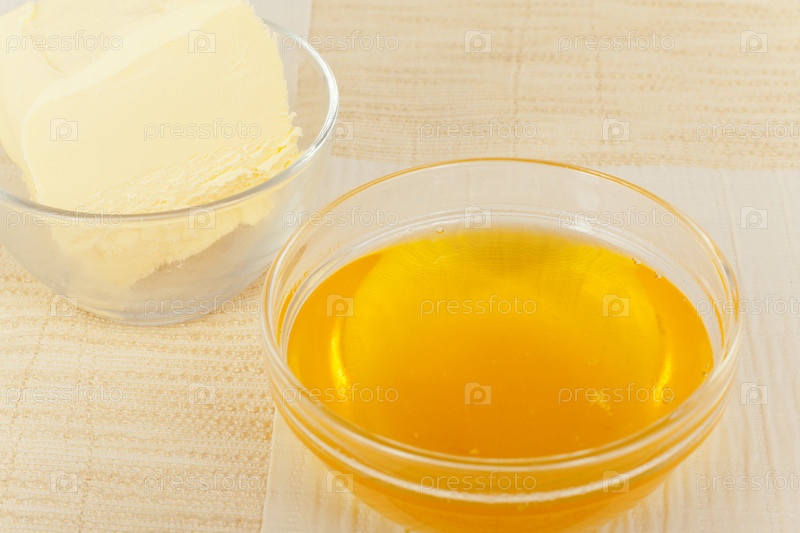Цельное и топленое масло в стеклянных мисках крупным планом