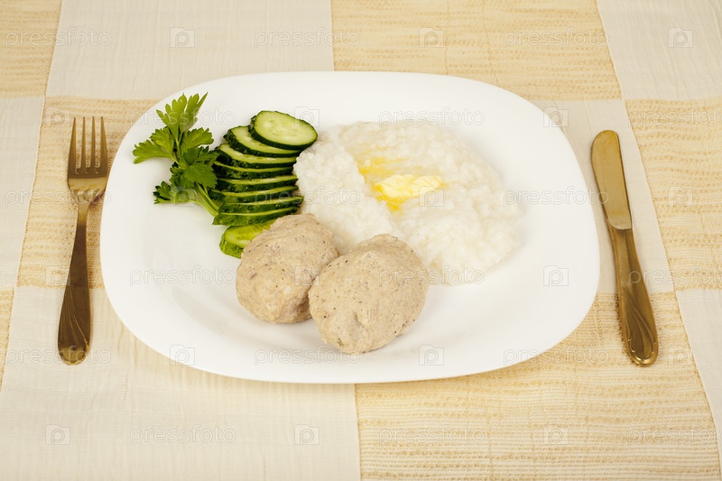 Мясные котлеты с рисовой кашей, приготовленной на пару