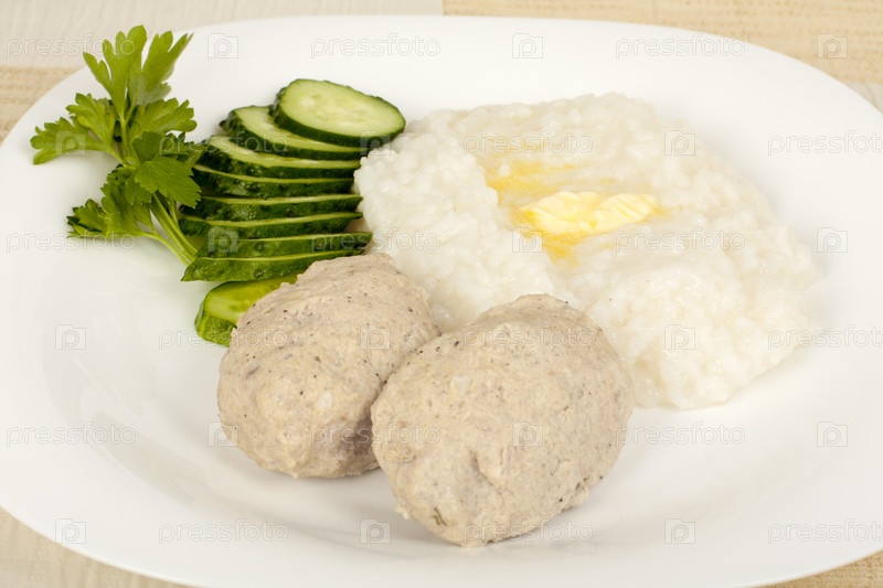 Мясные котлеты с рисовой кашей, приготовленной на пару