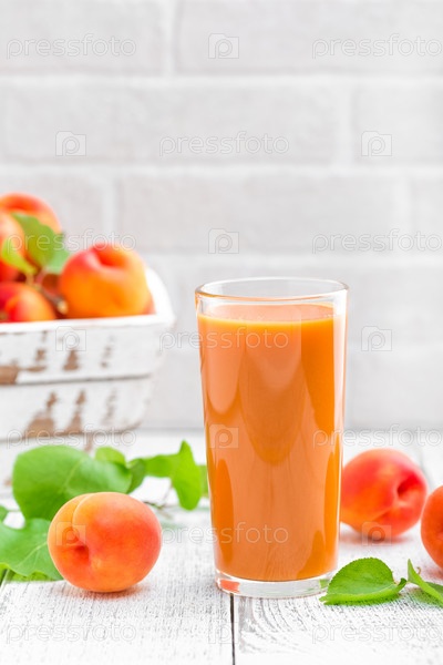 Абрикосовый сок и свежие фрукты с листьями