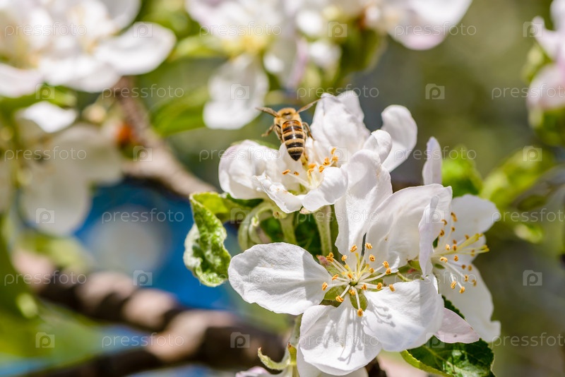Цветущая яблоня с пчелами