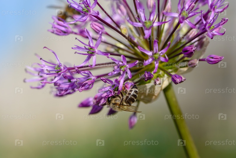 Зонтики цветов дикого лука с пчелами