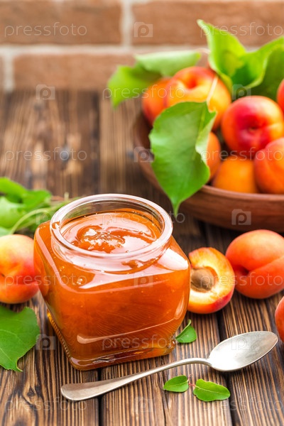Абрикосовое варенье в банке и свежие фрукты с листьями