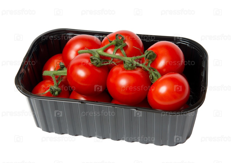 Красные помидоры в темный пластиковой емкости, изолированной на белом фоне