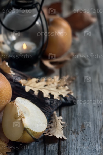 Азиатские груши, фонарь и осенние листья фон