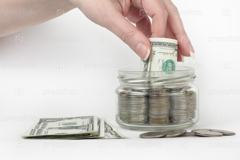 Рука, кладущая долларовые купюры в стеклянную банку с монетами