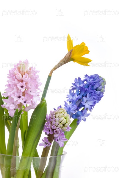 Весенние цветы - гиацинты и нарциссы на белом фоне