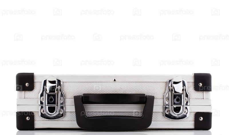 Алюминиевый чемодан, изолированный на белом фоне