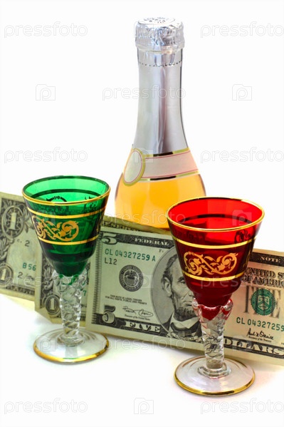 Винные бокалы, бутылка вина и доллары на белом фоне