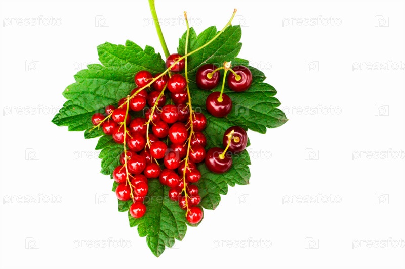 Смородина и вишня на зеленом листе