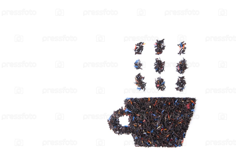 Символ чайной чашки из листьев черного чая на белом фоне