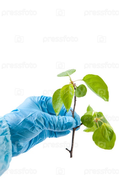 Зеленая ветка в руке ученого крупным планом