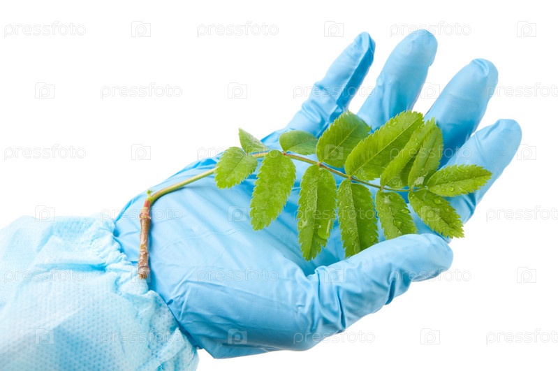 Зеленая ветка в руках ученого, белый фон