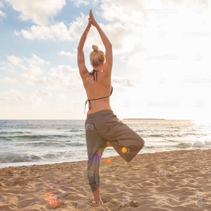Женщина занимается йогой на пляже