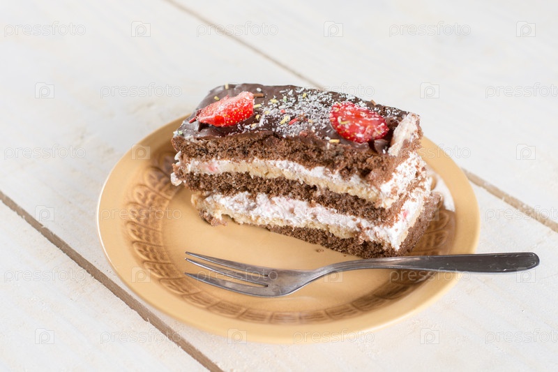 Кусочек шоколадного торта со свежей клубникой