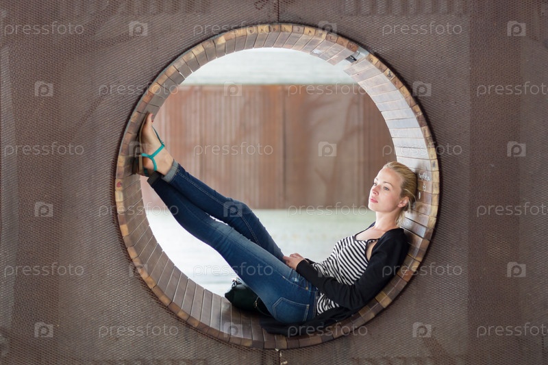 Молодая задумчивая женщина на круглой скамейке
