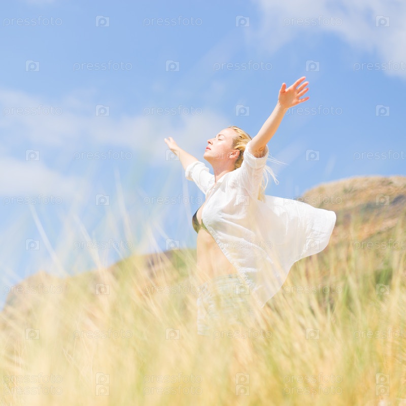 Счастливая женщина, наслаждаясь солнцем на каникулах