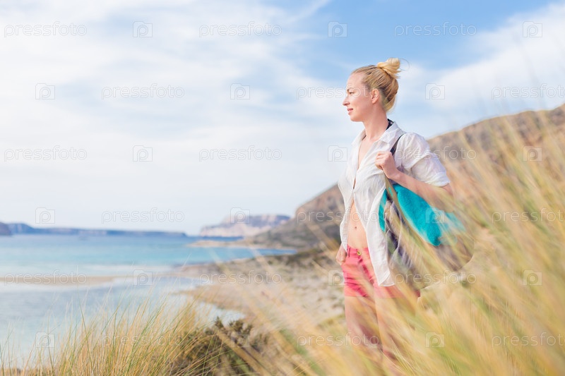 Счастливая женщина, наслаждаясь солнцем на каникулах