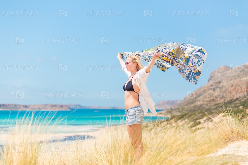 Счастливая женщина, наслаждаясь солнцем на каникулах