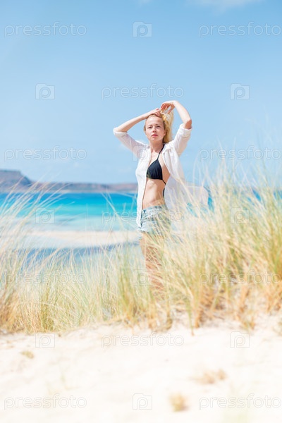 Счастливая женщина, наслаждаясь солнцем на каникулах