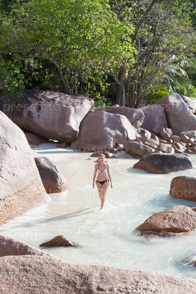 Женщина на пляже Ансе Лацио на острове Праслин, Сейшельские острова